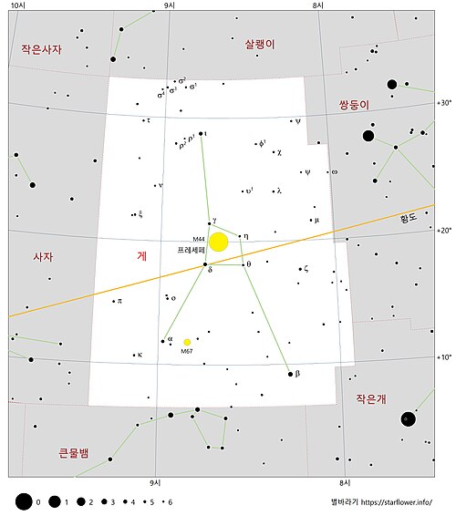 게자리는 겉보기에는 비교적 흐릿한 별들로 구성되어 있어 눈에 잘 띄지 않지만, 중심에 위치한 별 '프레세페'는 망원경으로 보면 매우 아름다운 산개성단으로, '벌집 성단'이라는 이름으로도 알려져 있습니다.